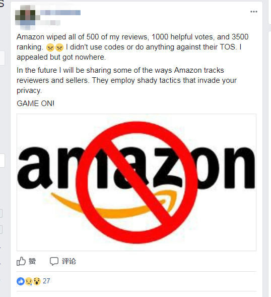 “亚马逊移除了我全部的500条评论、1000个有用点赞,排名跌到了3500,我没有用任何券也没有做任何违反他们条款的事情。我申诉了但是没有得到回应,接下来我将分享一些亚马逊追踪评论者和卖家的一些方法,他们还用了一些不正当手段侵犯你的隐私。游戏开始!”