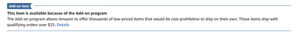 先来简单说下add on item,这个是对于低价的产品,亚马逊系统自动给添加的标志,带有此标识的产品必须满25美金买家才能下单,那么一旦被加了这个标志,买家很可能因为不满25美金而放弃此产品的购买,这很大程度上会影响卖家的销量。