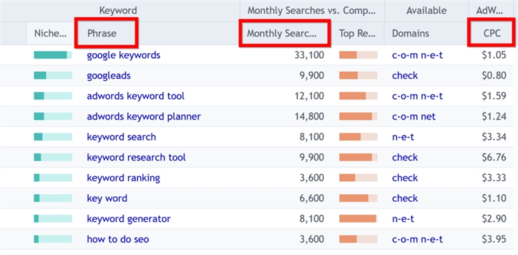 大多数结果卖家应该很熟悉,因为这些是谷歌关键词规划师中会看到的内容。事实上,“Phrase”、“Monthly Searches”和“CPC”这一栏是直接从谷歌关键词规划师中提取的,唯一不同的是,CPC在AdWords中显示为“Suggested Bid”: