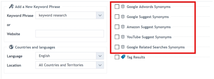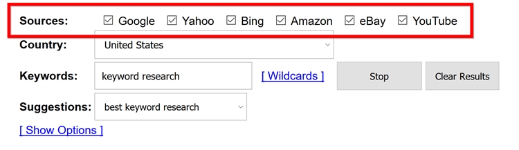 (4)你可以选择包含Google Suggest、Adwords、AmazonSuggest、YouTube Suggest和谷歌搜索同义词,以获得更多结果: