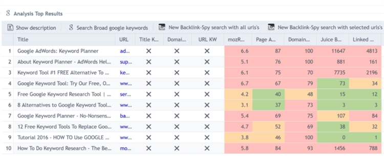 而且,SECockpit将显示搜索结果中排名Top 10页面的重要竞争指标,包括MozRank评分排名、域名管理和总链接: