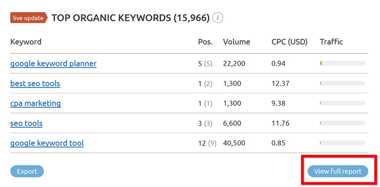 这一部分会显示竞争对手用于排名的前5个关键词。如果卖家要了解更多信息,可以点击“Full Report”: