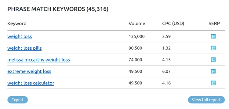 找出长尾关键词很有帮助,因为它们的竞争相对较小。例如,如果你想对关键词“weight loss”进行排名,很快就会发现它的竞争太激烈了,但是SEMrush会向你展示长尾词,比如“weight loss calculator”,这些词更容易排名: