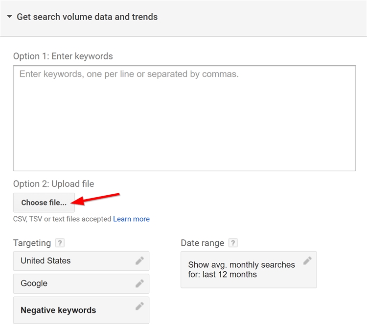 (5)然后,转到谷歌关键词规划师并选择“Get search volume data and trends”,导入从Keyword Snatcher下载的文件: