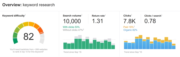 (2)Ahrefs将提供关于关键词的一系列数据: