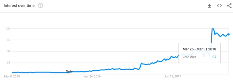 生酮饮食是通过将饮食结构调整为:脂肪(75%)、蛋白质(20%)、碳水化合物(5%)来模拟人体“饥饿绝食”状态,通过极少的碳水摄入,迫使身体从“燃烧糖碳供能”改成“燃烧脂肪供能”。随着Lebron James和Jessica Biel等名人的加入,生酮饮食迅速成为全球搜索量最高的饮食方式之一。以下是Keto Diet的Google Trends搜索趋势: