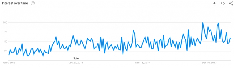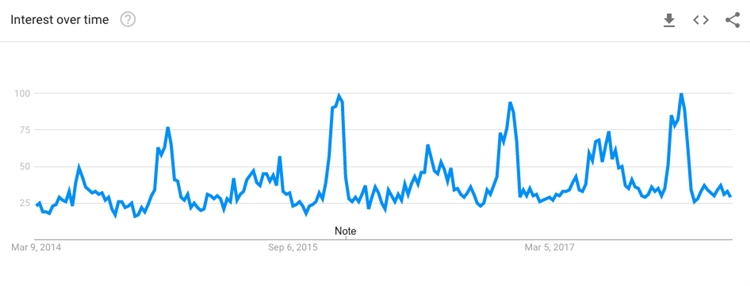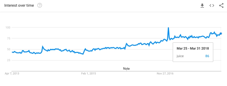 不管是鲜榨还是包装好的果汁,在炎热的夏季都非常热销,因为它止渴又健康。以下是果汁在Google Trends上的搜索趋势,卖家可能会注意到,每到一月左右以及夏天都会出现果汁的搜索高峰: