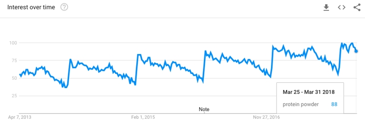 就像蛋白棒一样,蛋白粉(通常是“乳清蛋白粉”)的产品需求也在1月和夏季大幅上涨: