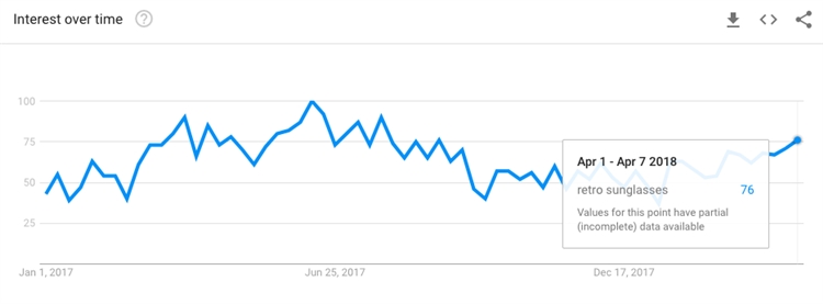 最近非常受欢迎的有90年代复古太阳镜(Retro Sunglasses)。由于90年代的怀旧情绪,此类太阳镜重新流行起来,其他时尚设计还包括猫眼款、矩形款和超大款。以下是“Retro Sunglasses”在Google Trends的搜索趋势: