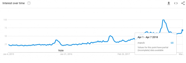 穿着带有你偶像名字的衣服感觉很好,它让吸引志趣相投的人更容易。另外,夏天也是销售明亮的T恤和帽子的绝佳时机。因此,卖家要抓住机会,推出新产品线,特别在Google Trends需求不断增长的情况下: