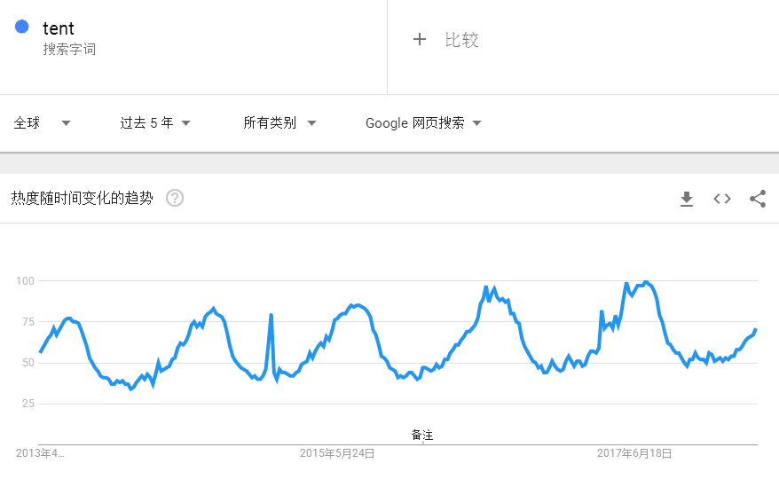 从谷歌趋势搜索结果显示,每年大约从3月份开始,帐篷的搜索量开始上升,到7月份达到顶峰。