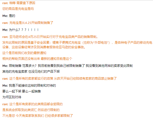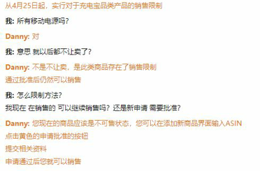这位客服人员告知卖家其受到的关于此事的最新通知:亚马逊在4月25日开始实行对于充电宝品类产品的销售限制。发布此限制的原因是基于安全因素:锂离子便携式充电宝(也称为“外部电池”),是各种电子产品的移动充电设备,这些设备经常涉及到消费者报告给亚马逊的安全事故。同时客服表示,以上为最新通知,但相关的帮助页面还没有出来。