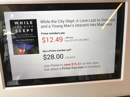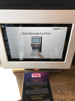 书店的墙上还设置了一些扫码器,可以读取图书背面的条码。读取后,会在扫码器的屏幕上显示图书的标准价格以及Prime会员享受的价格。