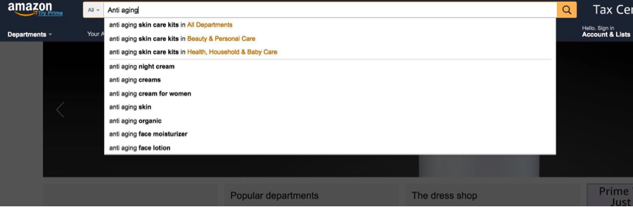 在搜索栏里刚打出Anti,就会出现一串有价值的搜索词。第一个出现的是Anti-aging,接下来出现的是Anti aging skin care kits和Anti-aging serum。