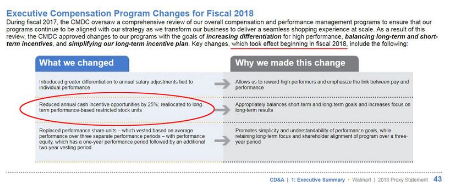 沃尔玛去年告诉股东,它将削减包括首席执行官Doug McMillon在内的高层管理人员的现金奖励25%,以支持更多的股票奖励,但是却并没有执行。