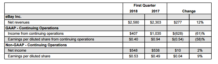 - 股票回购计划:eBay公司在2018年第一季度中回购了价值约为10亿美元的普通股,回购总量为2400万股。截至2018年3月31日,eBay公司已获批的剩余可回购股票总价值66亿美元。