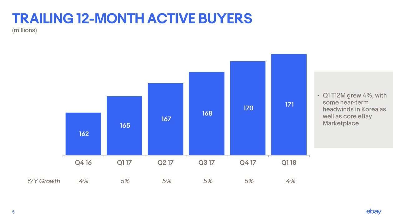 在本季度中,eBay公司旗下各个平台的活跃买家增加了4%,全球活跃买家总数达到了1.71亿。