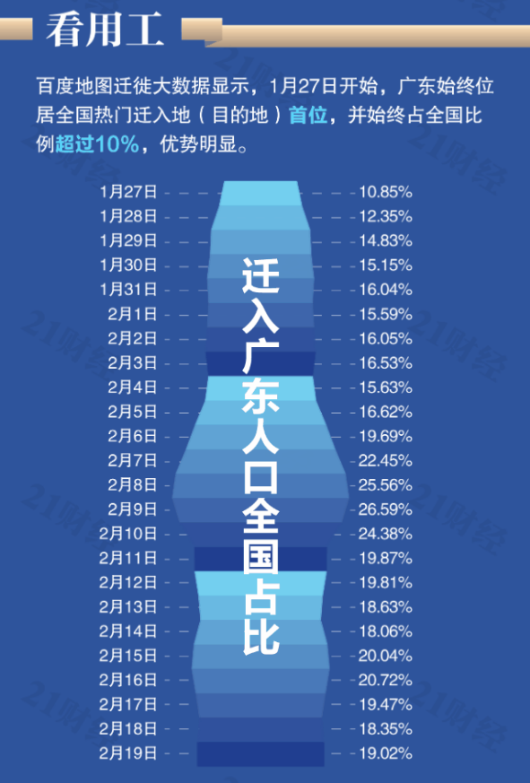 2月20日,21世纪经济报道记者梳理分析百度迁徙大数据发现,按照最新的2月19日数据,全国人口迁入量排名位居前十的城市分别为东莞、深圳、广州、苏州、佛山、杭州、北京、上海、成都和宁波,合计占当日全国迁入人口总量的24.87%,接近四分之一。