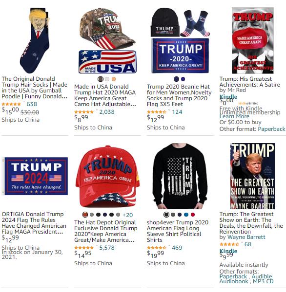 截止到周一下午,小编搜索在美亚上搜索相关关键词,亚马逊仍然显示了近1000条与“特朗普商品”有关的搜索结果,比如暴徒使用的帽子和旗帜。