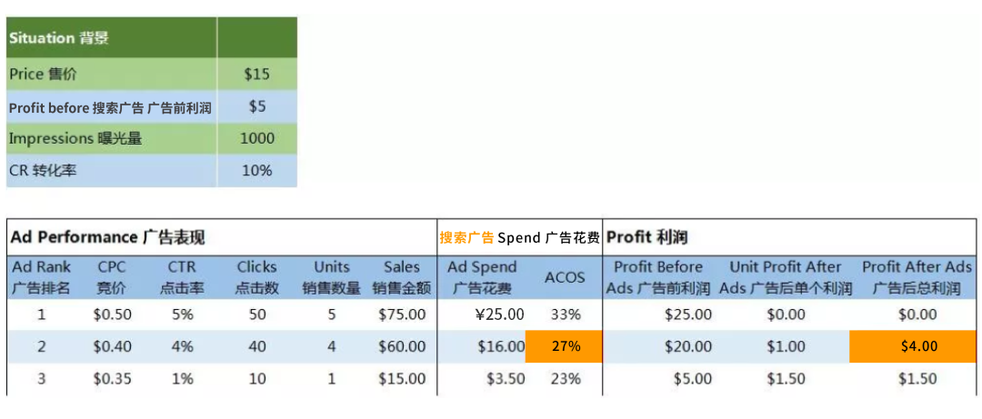 假设亚马逊上的某产品售价为15美元,使用搜索广告之前的产品利润为5美元 ,33%的产品利润率,ACOS刚刚好盈亏平衡。