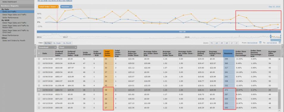 下一步,按日期转到“Business Reports”下的“Sales and traffic ”。向下滚动到底部,你将能够看到最近几天的详细数字。