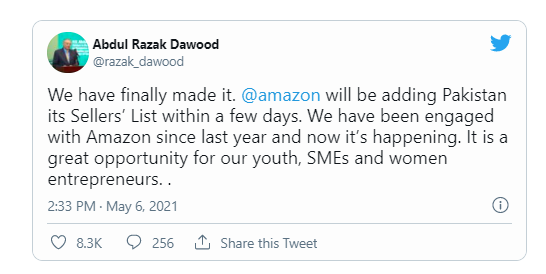 “我们终于做到了。@amazon将在几天内将巴基斯坦添加到其卖方列表中。自去年以来,我们就一直与亚马逊合作,现在它正在发生。对于我们的青年,中小企业和女企业家来说,这是一个巨大的机会。”