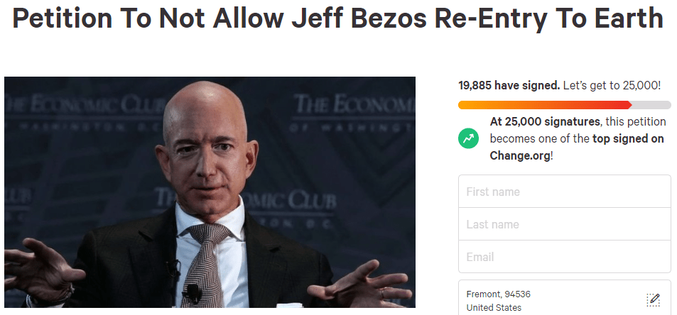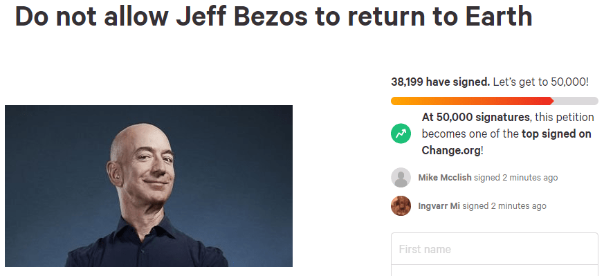 在他宣布太空旅行计划后没多久,就有人在网上发起请愿,要求“禁止贝索斯返回地球”,这条请愿超过5.7万人签名。