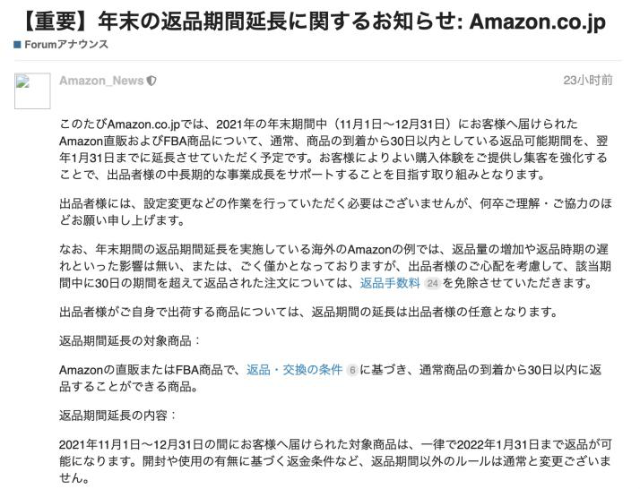 日前,亚马逊方宣布,针对日本站,在2021年假期期间(11月1日至12月31日)交付的卖家自配送及FBA订单,将把正常30天期限延长至次年1月31日。该举措旨在通过提供更好的购买体验和吸引更多客户来支持卖家的中长期业务增长。