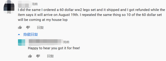 就在一周前,还有人表示:通过这个方法,订购了一套 60 美元的乐高积木,它发货了,不仅得到了退款,商品也将在8月19日到达。这也就是说即使买家要求全额退款不退货,亚马逊也将遵从买家无理要求。