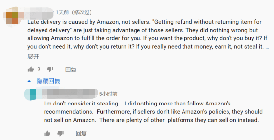 不管怎么说,这种退款不退货的手段“巧妙”地利用了亚马逊的规则漏洞,在消费者售后保障政策的“包庇”之下,成功白嫖。这种无耻的行为应该遭到唾弃,但是平台也应另外设定规则,以保护卖家权益。