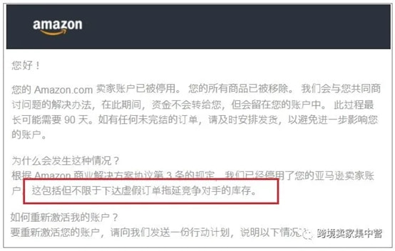 这种事情最近比较多发,我在之前的文章中也介绍过,一般封你店铺的理由就是下面邮件截图中说的:下达虚假订单拖延竞争对手的库存。