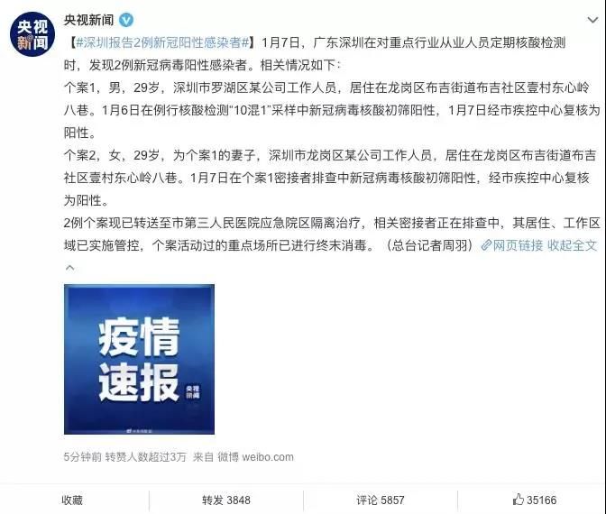 据央视新闻报道,1月7日,深圳市在对重点行业从业人员定期核酸检测时,发现2例新冠病毒阳性感染者。1个是深圳市罗湖区某公司工作人员,居住在龙岗区布吉街道布吉社区壹村东心岭八巷。另一个是前述病例的妻子,深圳市龙岗区某公司工作人员,居住在龙岗区布吉街道布吉社区壹村东心岭八巷。