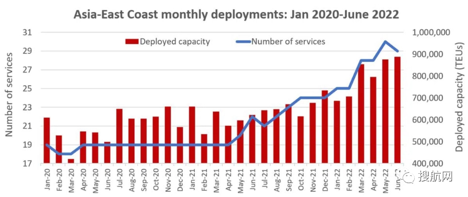 预计在6月份,亚洲-美东航线的部署运力将达到889,000TEU,这比2021全年平均水平增长了40%,比2020年的平均水平增长了56%。