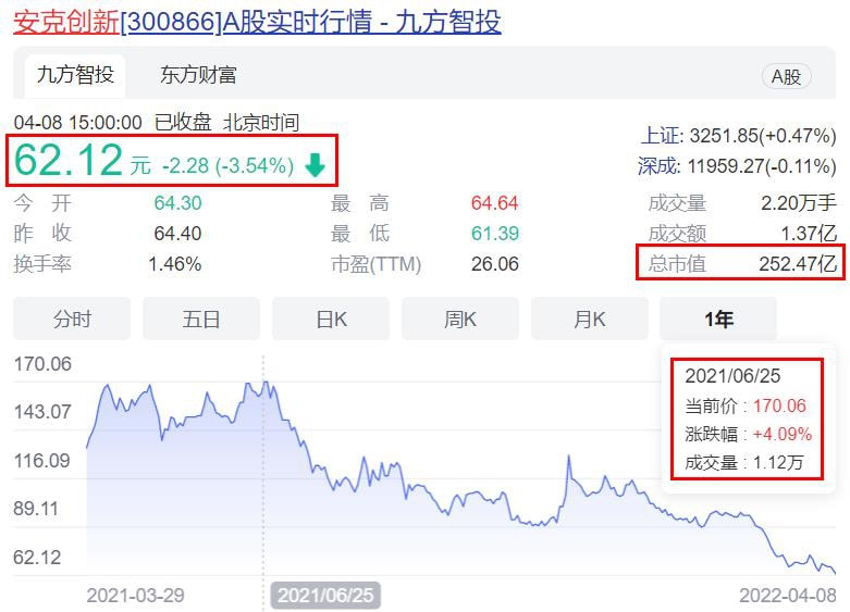 4月8日,安克股价继续下跌3.54%,收盘价62.12元,盘中最低触及61.39元,股价创历史新低,最新市值为252.47亿元。