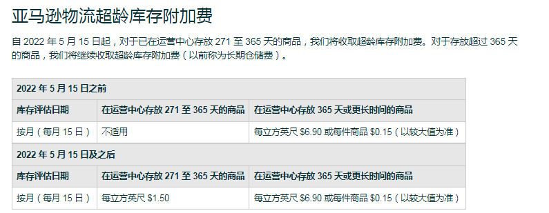 自5月15日起,对于已在运营中心存放271至365天的商品,亚马逊将收取超龄库存附加费;如果下个月的评估日(15日)之前,卖家库存中的商品仍未售出或移除,就需要支付这笔费用。
