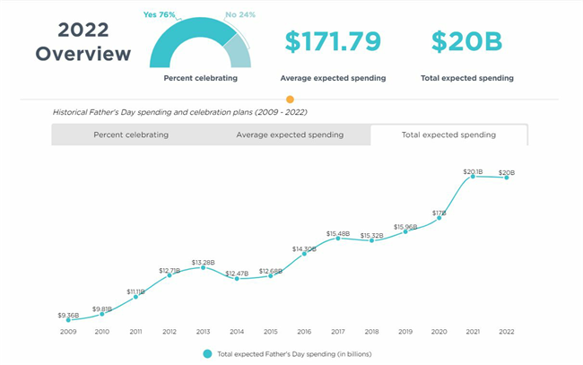 据NRF和Prosper Insights & Analytics发布的2022年度消费者调查显示,今年美国人在父亲节的平均支出将达170美元左右,消费总支出预计将达到200亿美元,虽然要低于母亲节,但仍然是一年中最大的购物节之一。对于跨境卖家来说,这是个不容错过的绝佳机会!