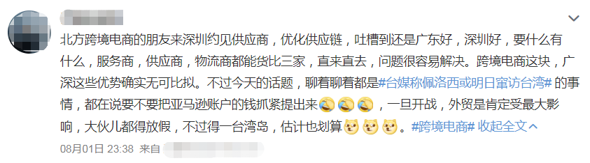 有卖家表示,北方跨境电商的朋友来深圳约见供应商,优化供应链,结果讨论的话题都是关于#台媒称佩洛西或明日窜访台湾#的事情,“都在说要不要把亚马逊账户的钱抓紧提出来,一旦开战,外贸是肯定受最大影响,大伙儿都得放假。”