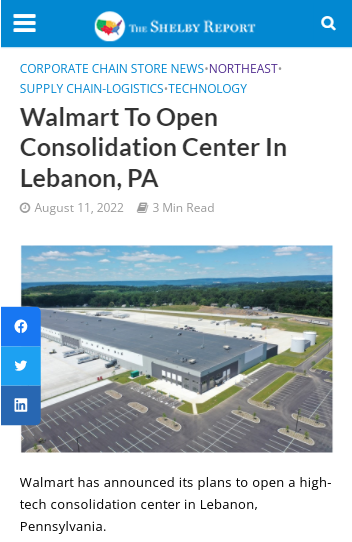 据外媒报道,沃尔玛将在宾夕法尼亚州的黎巴嫩县开设一个高科技配送中心,该中心占地40万平方英尺,其自动化技术能使沃尔玛包裹处理效率提高3倍,将为更多中小型供应商服务,同时向全美4700家门店提供产品。