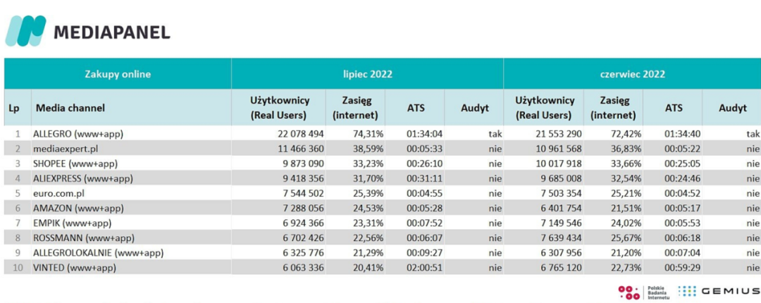 与6月相比,Allegro失去了52.5万用户(下降2.4%),但每位购物者花在该平台上的时间增加了36秒(0.6%)。Allegro Locally的用户则减少了1.78万(0.3%),每位购物者花在该平台上时间减少了2分23秒(25.2%)。
