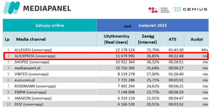 除了Allegro之外,还有几个平台的访问量也有所下降:Mediaexpert.pl失去了50.48万用户,下降了4.4%;Euro.com.pl失去了4.11万用户,下降0.5%;亚马逊失去886.3万用户,下降得最多,即12.2%。