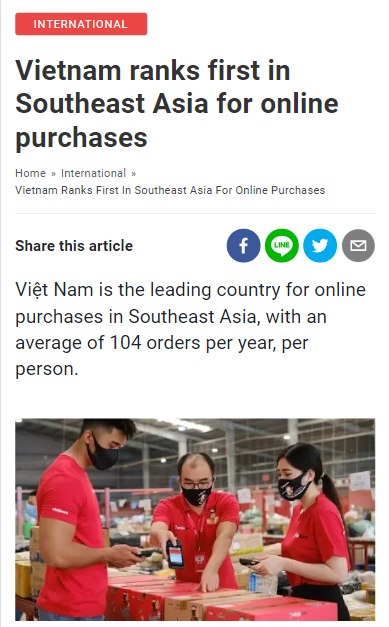 新加坡物流供应商Ninja Van Group及其母公司DPDgroup近日发布的一项跨境电商研究显示:越南的网购平均订单数位居东南亚榜首,每年人均多达104个订单,高于东南亚平均水平的66个订单。