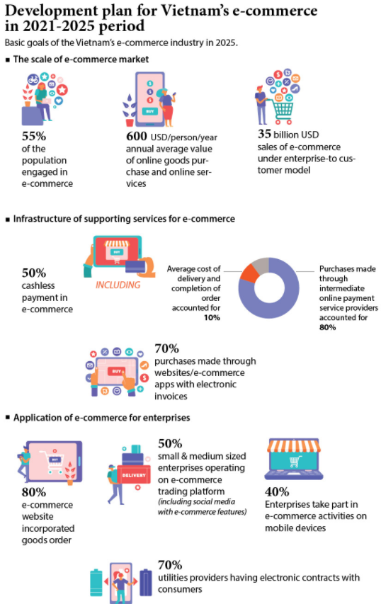 政策方面,越南为电子商务的发展制定了扶持机制,有意进入东南亚、中国、欧盟、韩国、日本、美国等主要市场。越南政府批准的《2021-2025年国家电子商务发展计划》指出,越南将在全球部分大型电商平台上建设国家馆,组织聚集各种知名品牌的越南展位。