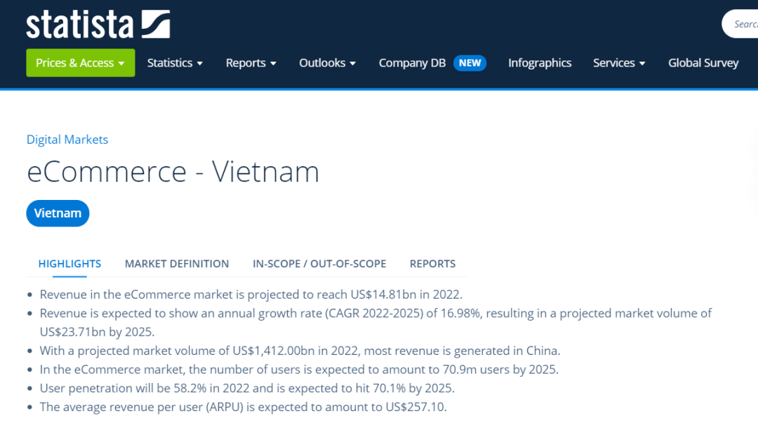 根据德国数据门户网站Statista的数据,越南有望在2025年之前成为仅次于印度尼西亚的东南亚第二大电子商务市场。