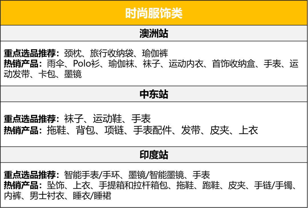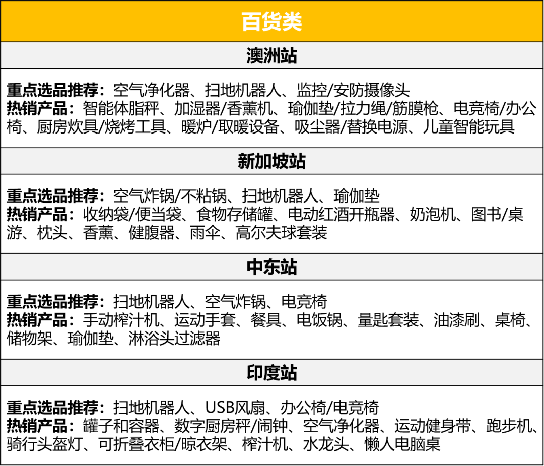 除了以上新站点四大品类的综合榜单,小编也针对各个站点的重点选品推荐为大家带来更细致需求,致力从细节打动买家~