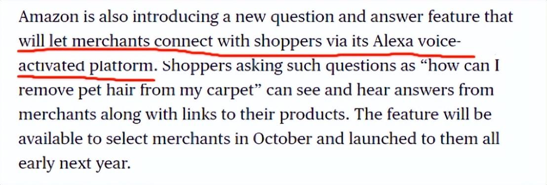 简单点来说,当买家提出一些常见问题时,例如“我如何清理地毯上的宠物毛?”Alexa可能会为你推荐除尘器。“我如何消除土壤污渍的气味?”Alexa可能会为你推荐空气清新剂。